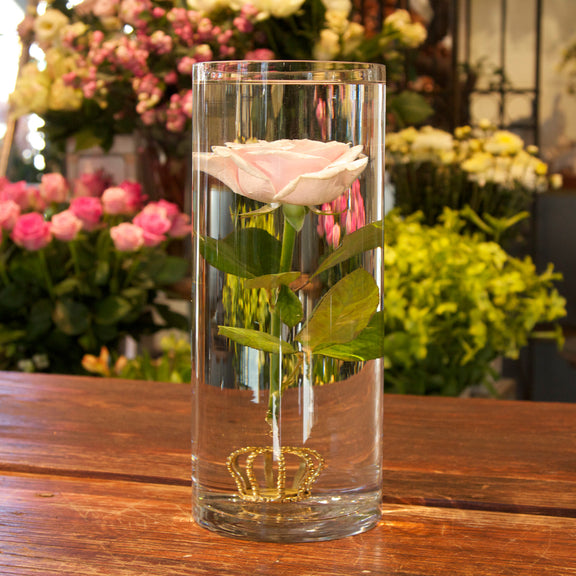 Tie the rose to the plumb bob. Lower the rose and plumb bob into a glass vase so that the rose is completely covered with water. If necessary, add 1 small cap of bleach to the water.