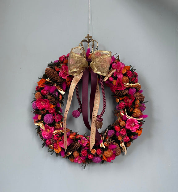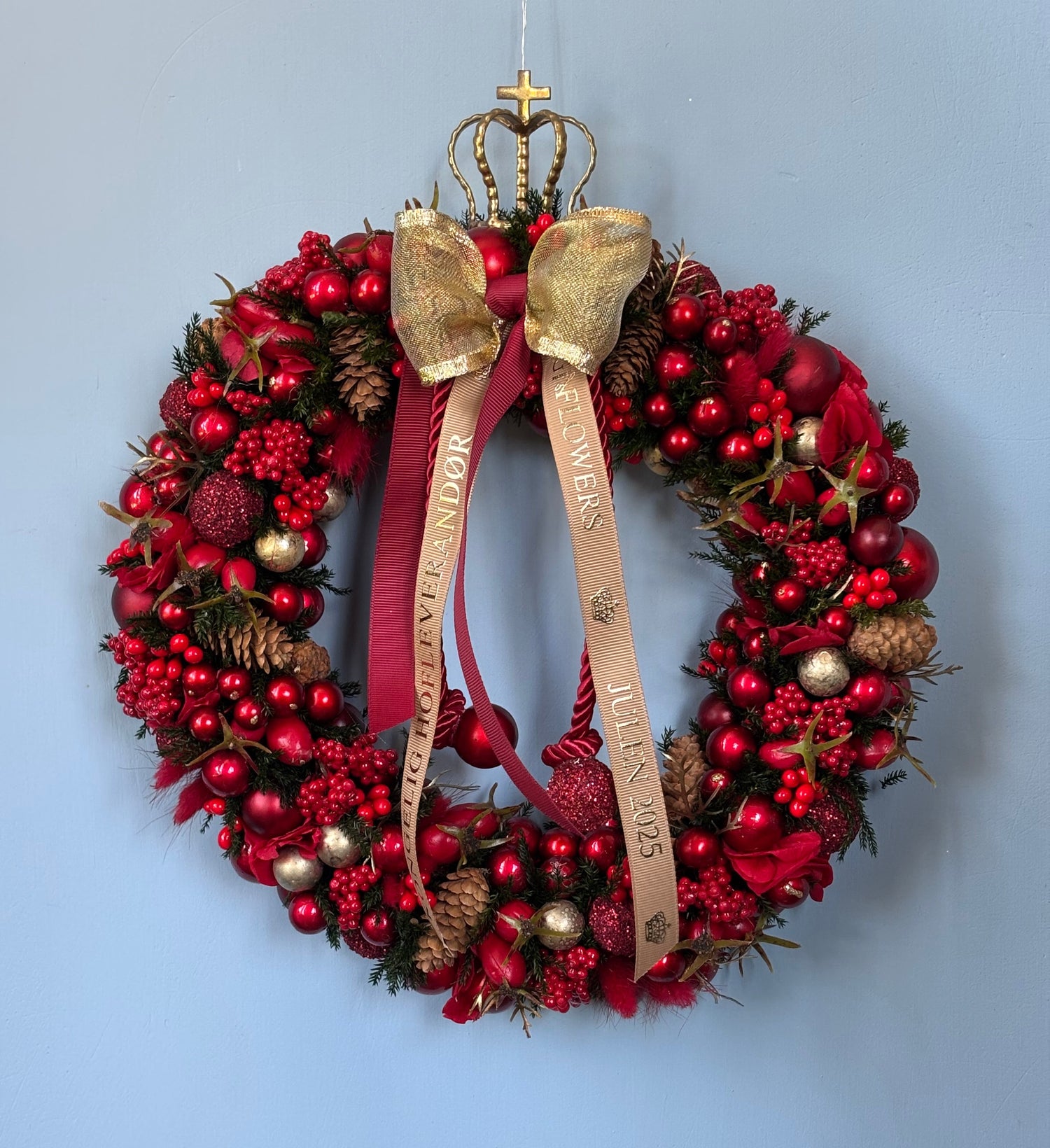 Dørkrans med royalt touch. Denne dørkrans er lavet med en smuk guldkrone på toppen.