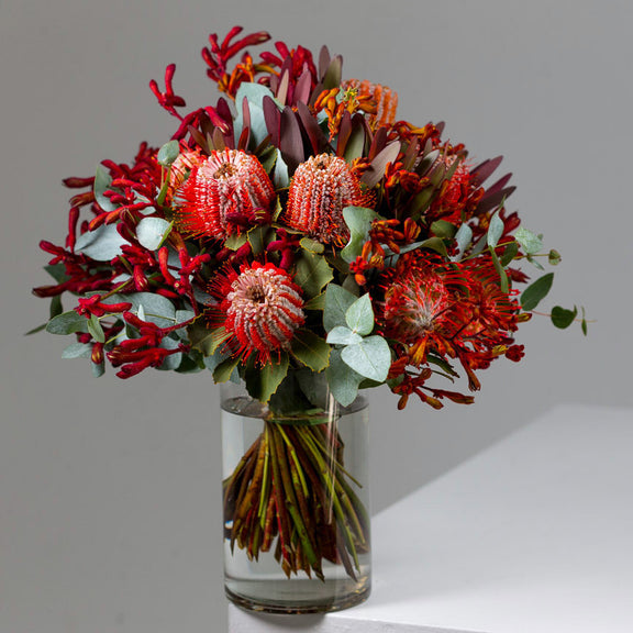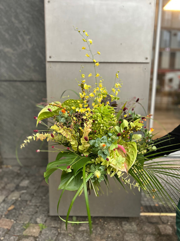 Buket med eksotiske blomster. Buketten er lavet med en variation af eksotiske blomster. Blomsterudvalget kan variere men er altid eksotiske blomster i forskellige farver.