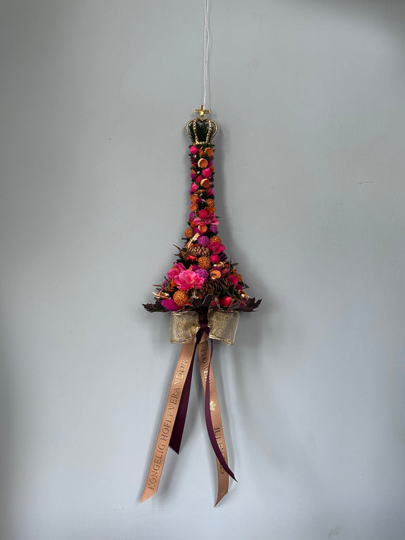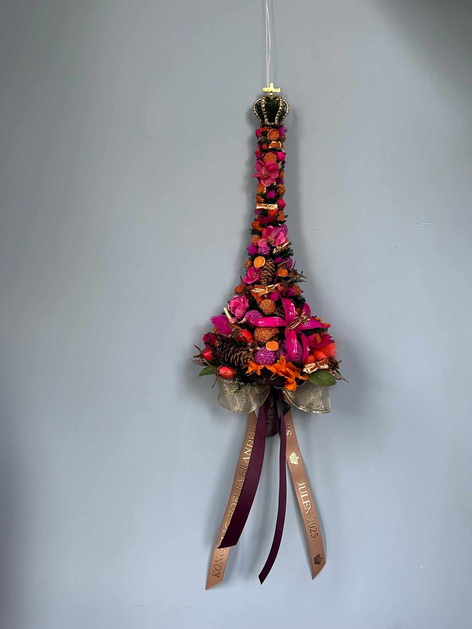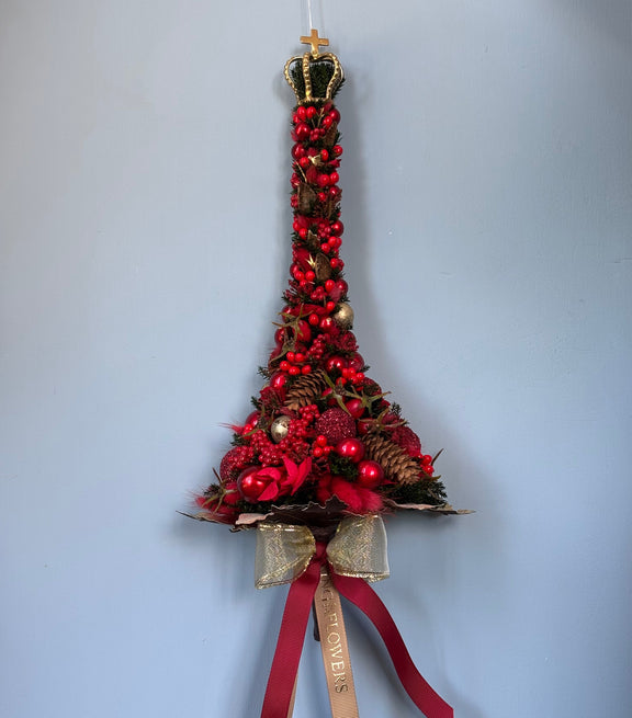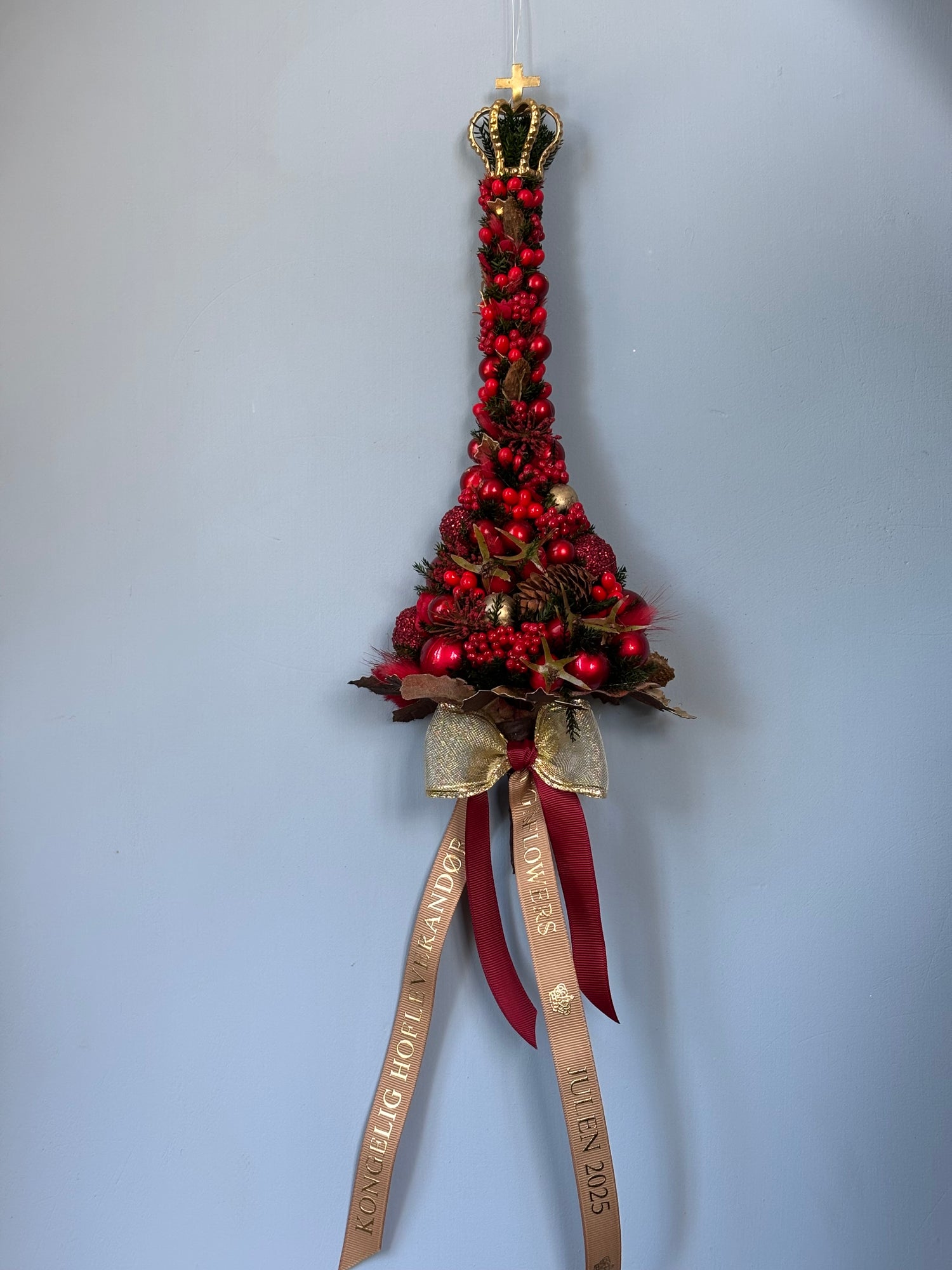 Håndbundet halve Bering juletræer med krone på top. Træerne er lavet så de kan hænge på væggen, men pynter også pænt liggende på bordet.