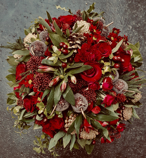 En Julebuket med blomster, gran, kogler og glimmer, a´la foto