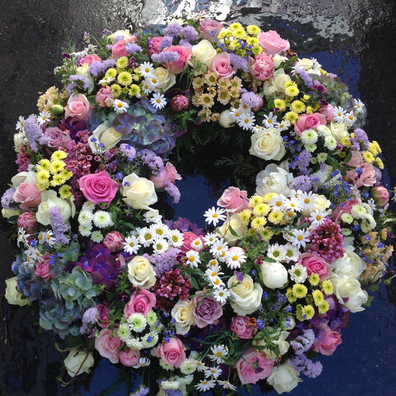 Klassisk Bering rundpyntet krans med årstiden blomster.